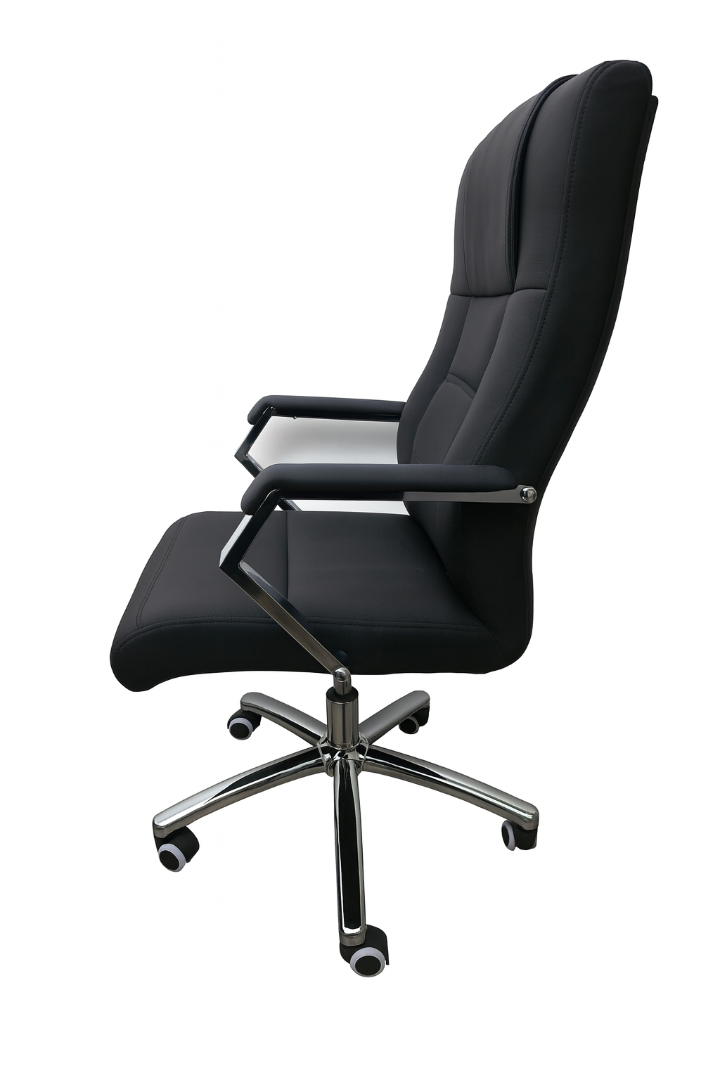 High-back design for enhanced back and shoulder support Soft, cushioned seat and backrest for all-day comfort Smooth swivel function for easy movement Durable chrome base with rolling castor wheels Padded armrests with chrome detailing Easy to clean and maintain upholstery