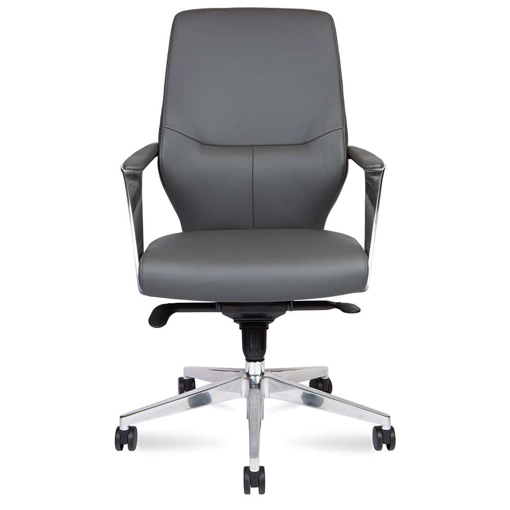 Upholstered in high-quality grey PU leather Ergonomic high-back design for all-day support Thick padded seat and backrest for comfort Stylish chrome-finished armrests Smooth 360° swivel function Height-adjustable gas lift mechanism Heavy-duty chrome five-star base with castor wheels