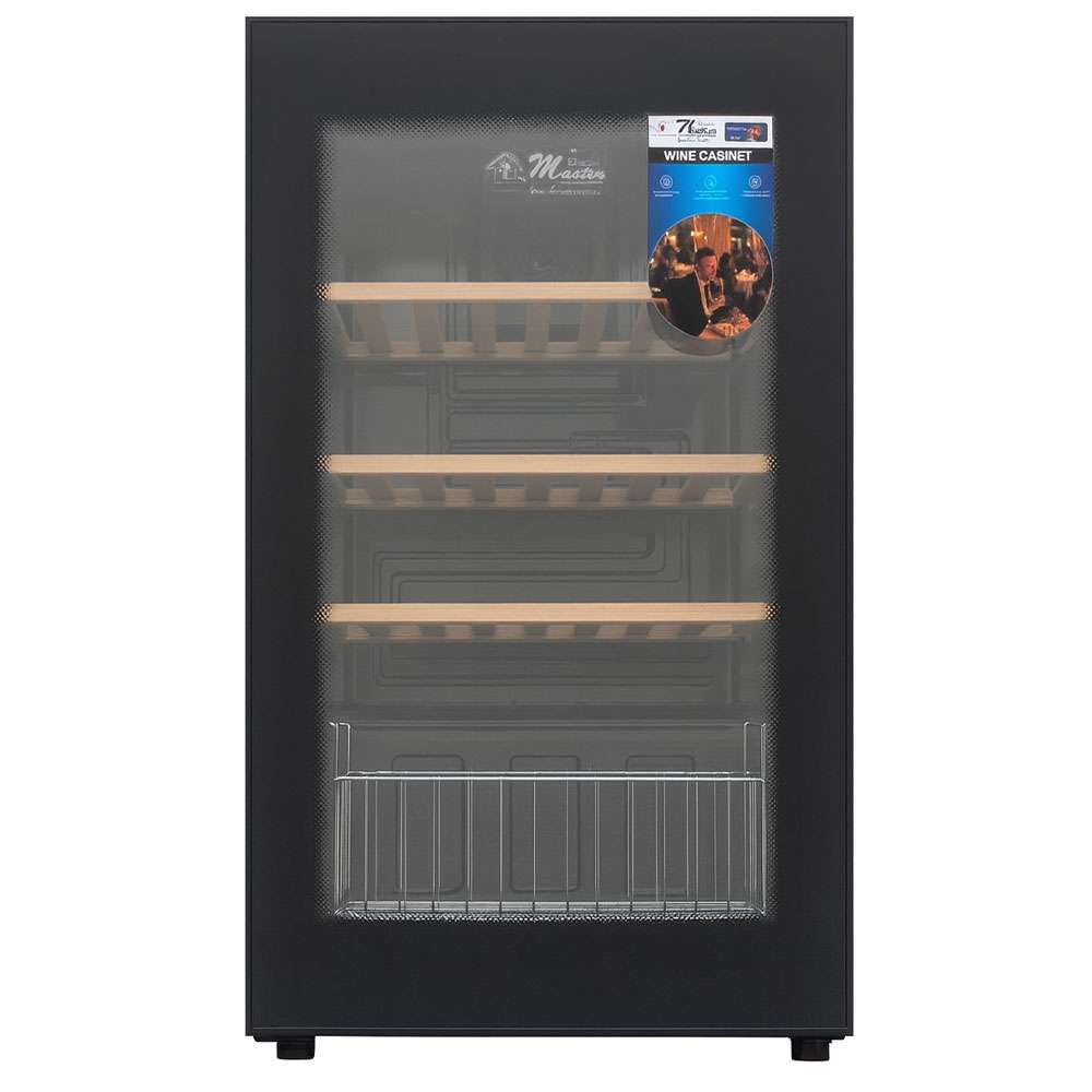 Stylish wine cabinet with clear glass door Designed to store and display wine bottles neatly Wooden shelves for proper bottle positioning Maintains ideal temperature for wine storage Sleek black finish for a modern look Quiet and efficient operation Easy-to-use temperature control Suitable for homes, bars, restaurants, and entertainment areas